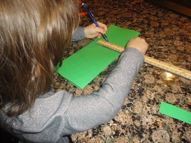 First each girl cut off a strip from the short side of the construction paper and set it aside for the handle. Then she folded the paper in half lengthwise and used a ruler and pencil to mark lines that went from the folded edge to about an inch from the end. I was surprised at how well both of the girls were able to handle the ruler to make straight lines.